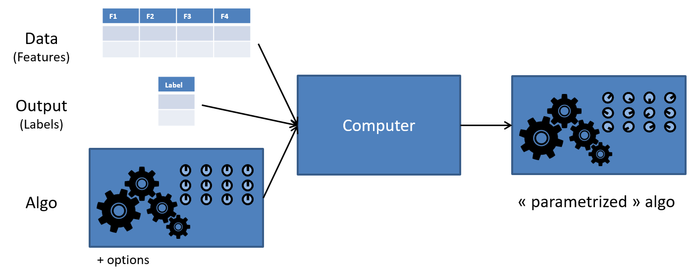 Pour être plus précis, l’ordinateur ne va pas créer un programme “à partir de rien”: on va en fait choisir un algorithme de machine learning (Decision Tree, Random Forest, Gradiant Boosting…) et l’entrainement permettra de choisir les paramètres de l’algorithme (qui peuvent être plusieurs milliers, voire plusieurs millions dans le cas de la “deep learning”, une des familles les plus récentes des algorithmes de machine learning). Cet algorithme “paramétré” pourra ensuite être utilisé en production lorsqu’une nouvelle demande de crédit sera soumise à la banque.