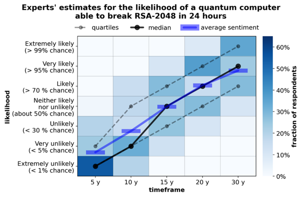 Personne ne sait vraiment quand (ni même si) il sera possible de construire de tels ordinateurs quantiques. Même les experts ont des avis fortement divergents, comme le montre l’illustration ci-dessous, où 46 experts ont été interrogés en 2021. La moitié d’entre eux estimaient qu’il y avait au moins 50 % de chances qu’un tel ordinateur quantique soit construit d’ici 15 ans, c’est-à-dire d’ici 2036.