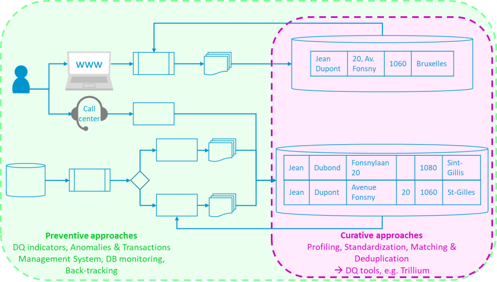 - specifieke hulpmiddelen voor data quality (4) te gebruiken in synergie met de business om strategieën te implementeren voor het oplossen van de gedetecteerde problemen (curatieve aanpakken);