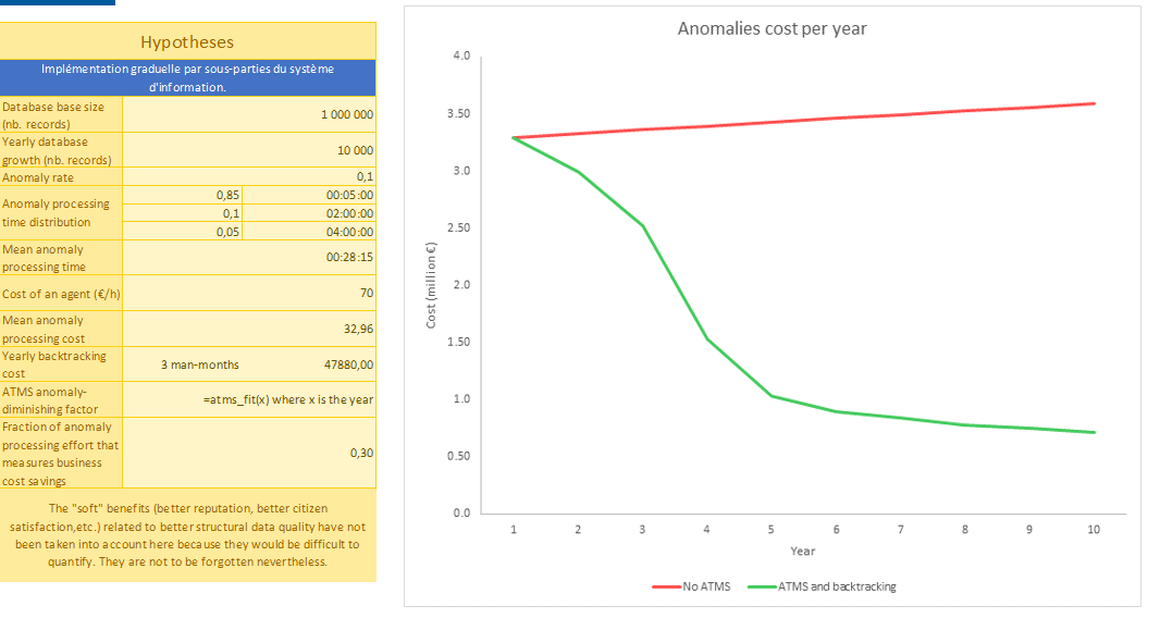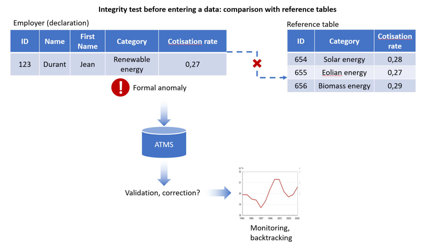 Dans ce cas, il n’est pas toujours possible de vérifier la correction des valeurs de la base de données de manière automatique. En effet, lorsqu’une incohérence apparaît entre une valeur saisie au sein de la base et les tables de référence permettant d’en tester la validité, il peut s’avérer indispensable, lorsque les enjeux sont stratégiques, de procéder à une vérification intellectuelle, en contactant le citoyen ou l’entreprise concernée, par exemple. C’est là, entre autre, que réside l’intérêt d’un ATMS, en vue d’enregistrer et d’historiser les anomalies et transactions, permettant un monitoring statistique continu de celles-ci et une modification éventuelle du domaine d’application.
