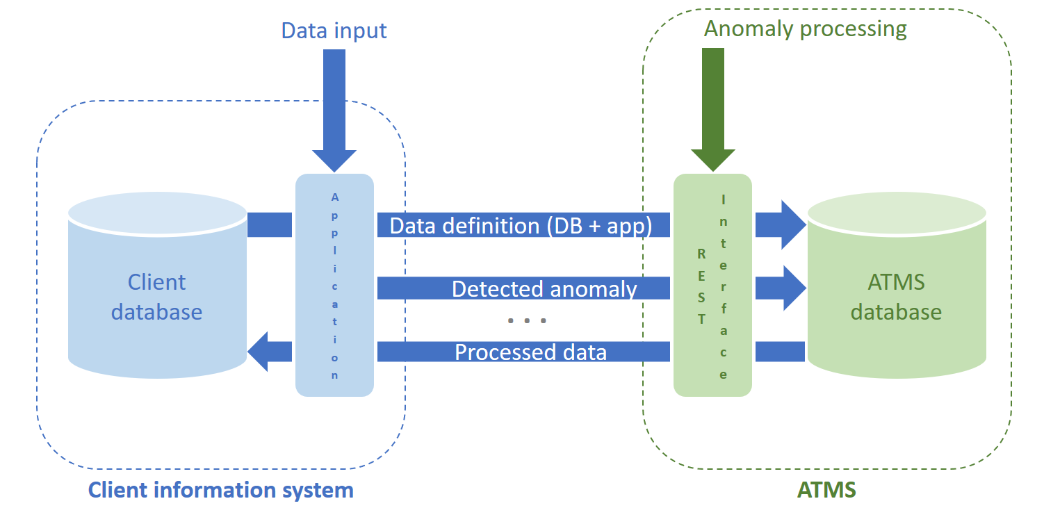 - L’échange d’anomalies et de métadonnées : l’interface lit les messages entrants et popule les tables appropriées de l’ATMS, côté domaine de définition ou gestion des anomalies et transactions en fonction des cas. Elle permet également de récupérer le résultat du traitement d’une anomalie par un agent.