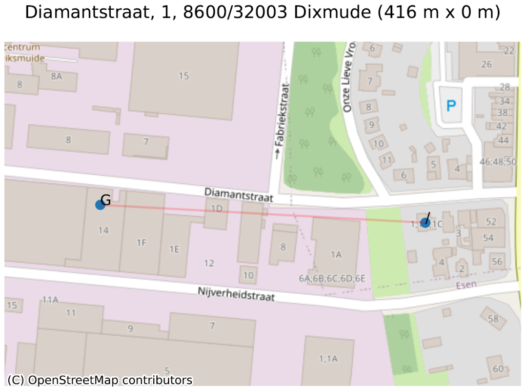 Het tweede is een gevolg van het probleem dat in ons vorige artikel werd geïllustreerd: om adressen tussen ‘1’ en ‘3’ te maken, kun je ze maken met huisnummers ‘1A’, ‘1B’, ‘1C’… (zonder busnummer), of ze allemaal ‘nummer 1’ noemen, maar met een busnummer ‘A’, ‘B’, ‘C’… In de ‘Diamantstraat’ in Diksmuide is (ongetwijfeld per ongeluk) een hybride keuze gemaakt: naast de 1 vinden we ‘1A’, ‘1B’, … ‘1F’, dan … ‘1 bus G’! Dit creëert een grote afstand tussen de 1 (basisadres) en de 1 (bus G).