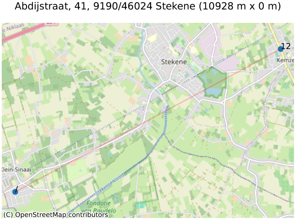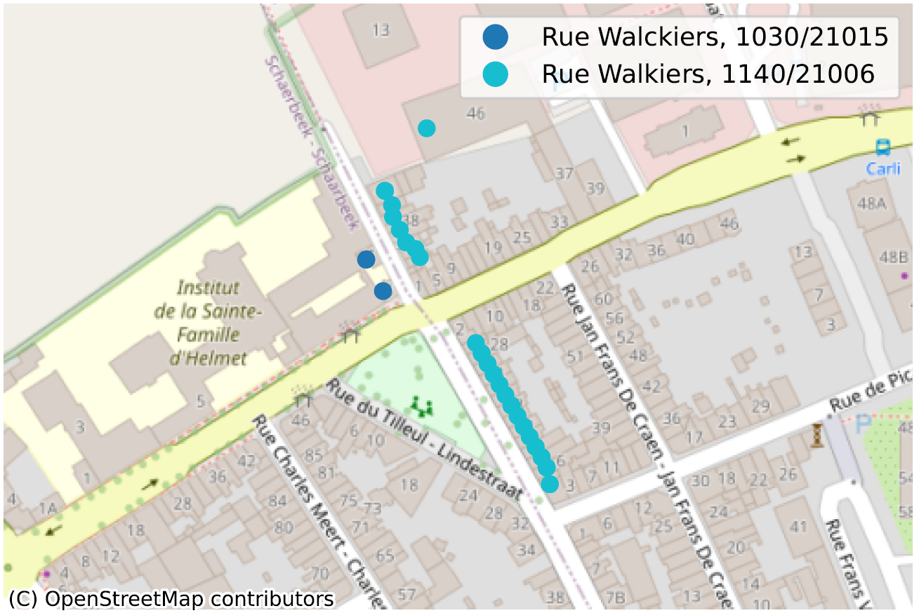Om dit te illustreren nemen we twee voorbeelden, weergegeven in de figuur hieronder. Het eerste voorbeeld (Abdijstraat, 41 te 9140 Stekene) toont aan dat het basisadres (Abdijstraat, 41, voorgesteld door een ‘/’) zich op 11 kilometer van Abdijstraat, 41 bus 12 bevindt. We vonden bijna honderd zeer vergelijkbare voorbeelden.