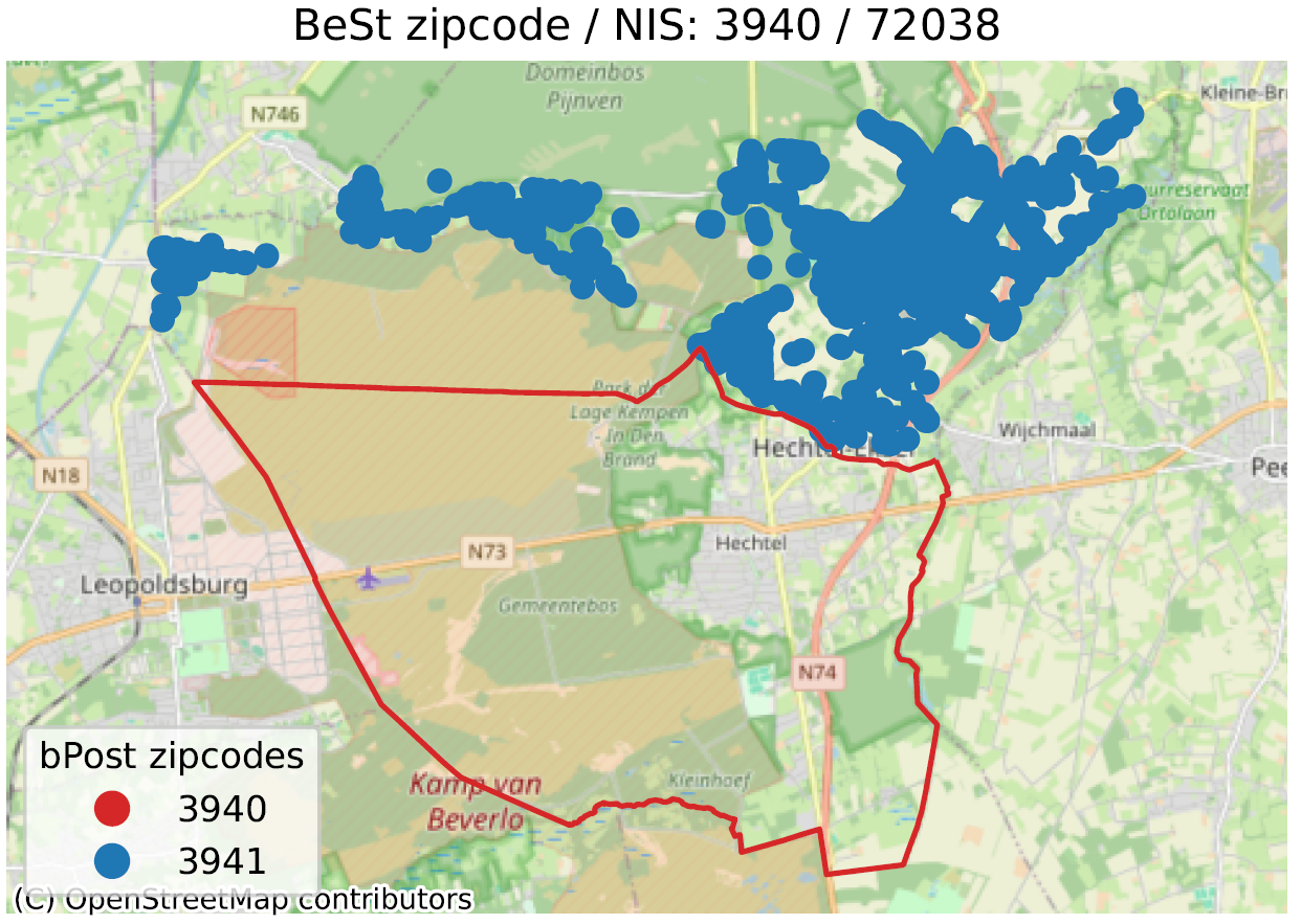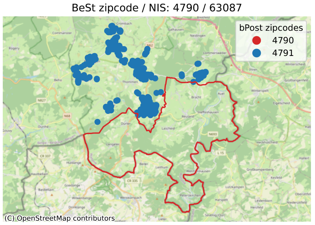 - In de tweede vergelijken we de grenzen van de postcodes gedefinieerd door bpost (de Belgische postdienst) met de postcodes van adressn uit BeSt Adress;