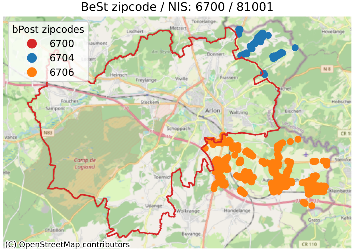 Merk op dat de geregistreerde ‘uitwisselingen’ altijd binnen dezelfde gemeente liggen (Aarlen voor het voorbeeld). Terwijl BeSt ervan uitgaat dat alle adressen in de gemeente Aarlen op 6700 liggen, gaat bpost er wel van uit dat een deel van het grondgebied op 6704 (Guirsch) of 6706 (Autelbas-Barnich) ligt, twee postcodes die BeSt niet kent.