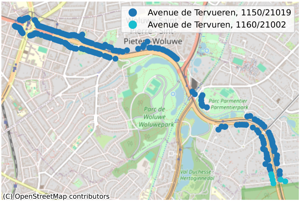 - Straten die verschillende gemeenten doorkruisen en in elke gemeente een andere schrijfwijze hebben: ‘Rue de Monténégro, 1060’, vs ‘Rue du Monténégro, 1190’;