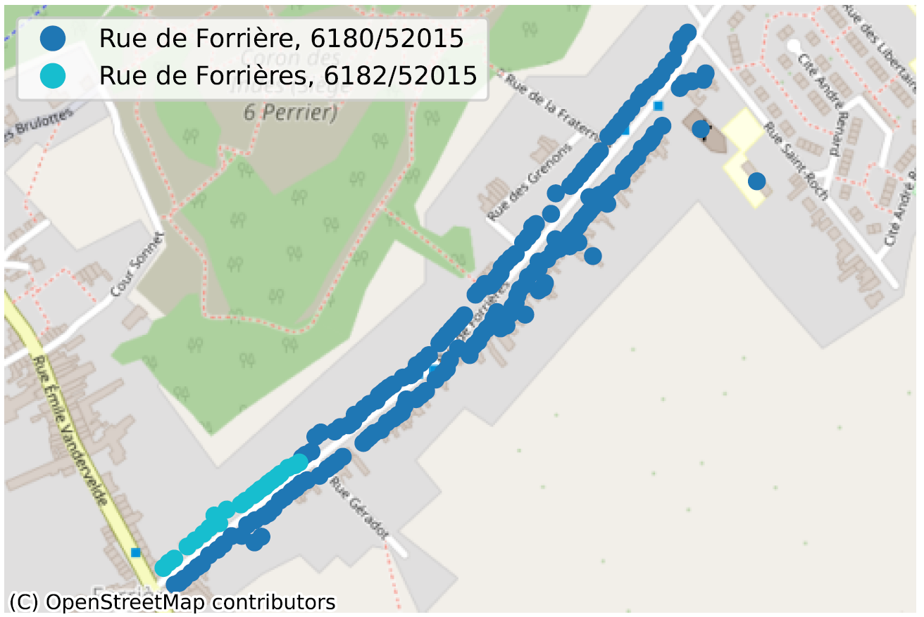 Voor deze analyse gaan we een ‘klassieke’ benadering op basis van karakterketen combineren met een geografische benadering. We starten met het identificeren van de lijst van alle paren van aangrenzende straten (d.w.z. de ene heeft een adres op minder dan 100 meter van de andere). Vervolgens controleren we op kleine verschillen in straatnamen. We zien meestal twee situaties: