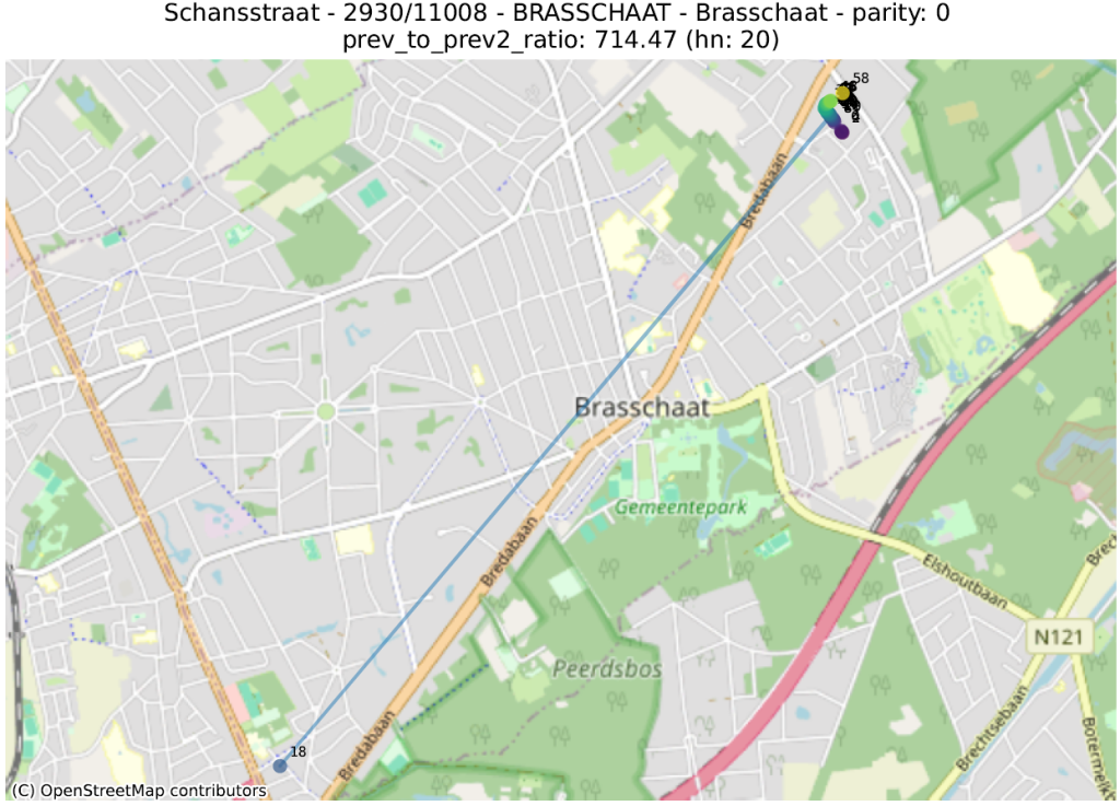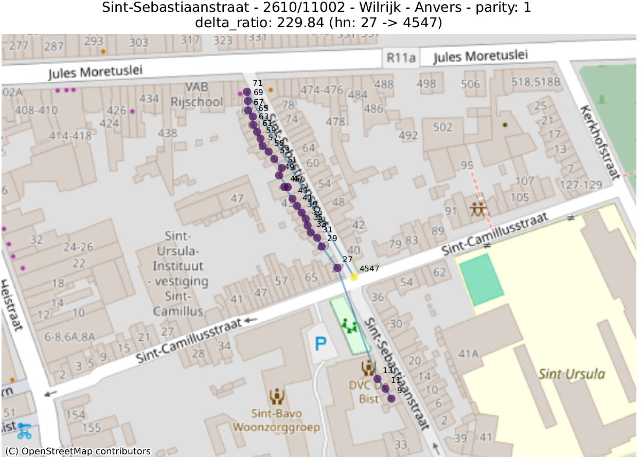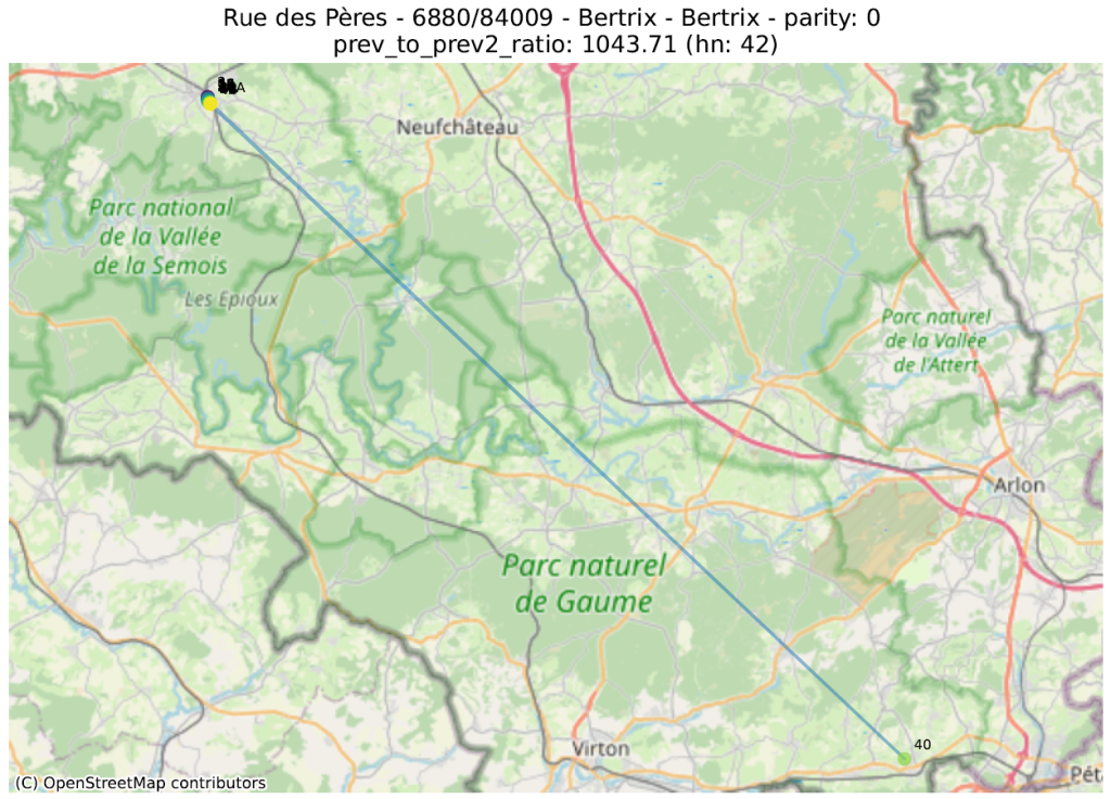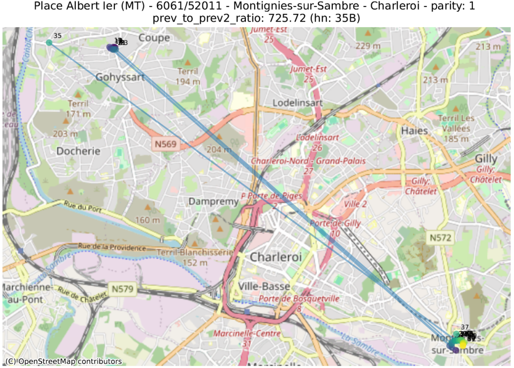 Hier bekijken we de geometrische vorm die bestaat uit de opeenvolging van punten van adressen met dezelfde pariteit, voor dezelfde straat en postcode. Vervolgens berekenen we een aantal metrieken op deze lijn, ervan uitgaande dat de hoogste waarden duiden op een afwijking.