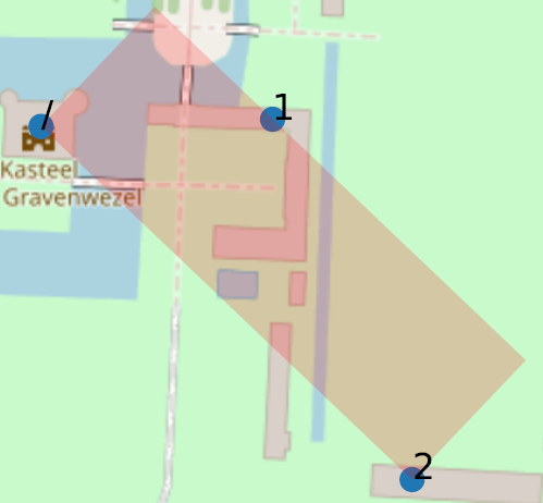 Voor elk adres met busnummers schetsen we de ‘minimum rotated rectangle’ , d.w.z. de rechthoek met de minimale oppervlakte die alle punten omvat (de coördinaten van het ‘basis’-adres, voorgesteld door ‘/’, en die van elk van de bussen), waarbij elke rotatie van de rechthoek mogelijk is. Zo’n rechthoek die twee punten omvat zal een breedte van nul hebben en een lengte gelijk aan de afstand tussen de punten. In het geval van meerdere niet-uitgelijnde punten zullen beide afmetingen positief zijn.