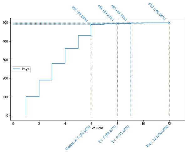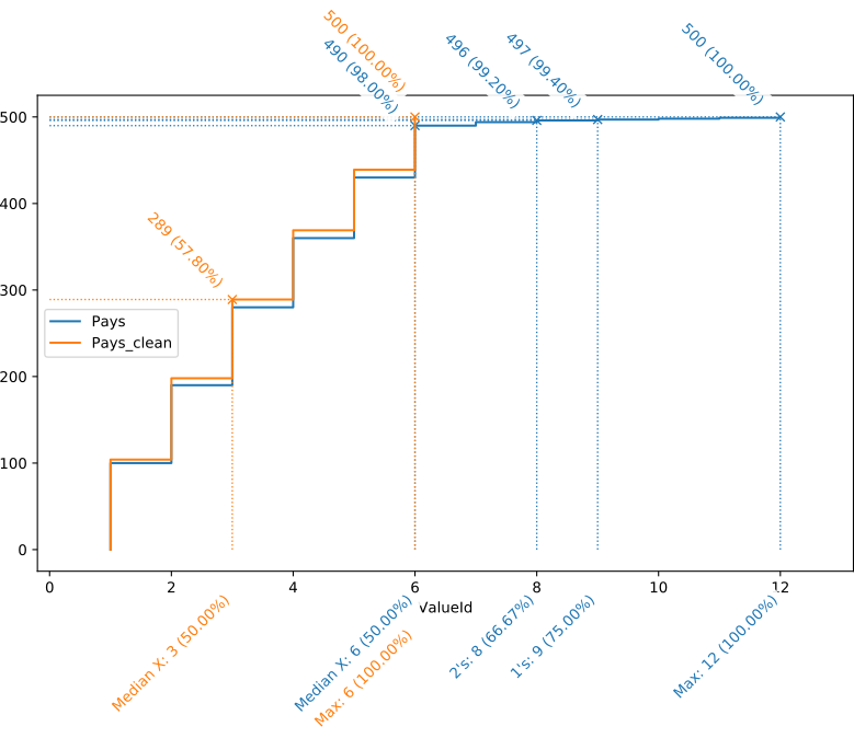 La représentation visuelle de ce tableau synthétique, ci-dessous, se lit de la façon suivante : l’abscisse (axe horizontal) représente le nombre de valeurs distinctes, triées par nombre d’occurrences ; l’ordonnée (axe verticale) le nombre de records cumulés. Par exemple, on y voit que les 6 valeurs les plus fréquentes, soit 50 % des valeurs distinctes (d’où le “Median X” en label), représentent à elles-seules 490 lignes, soit 98 % des données.