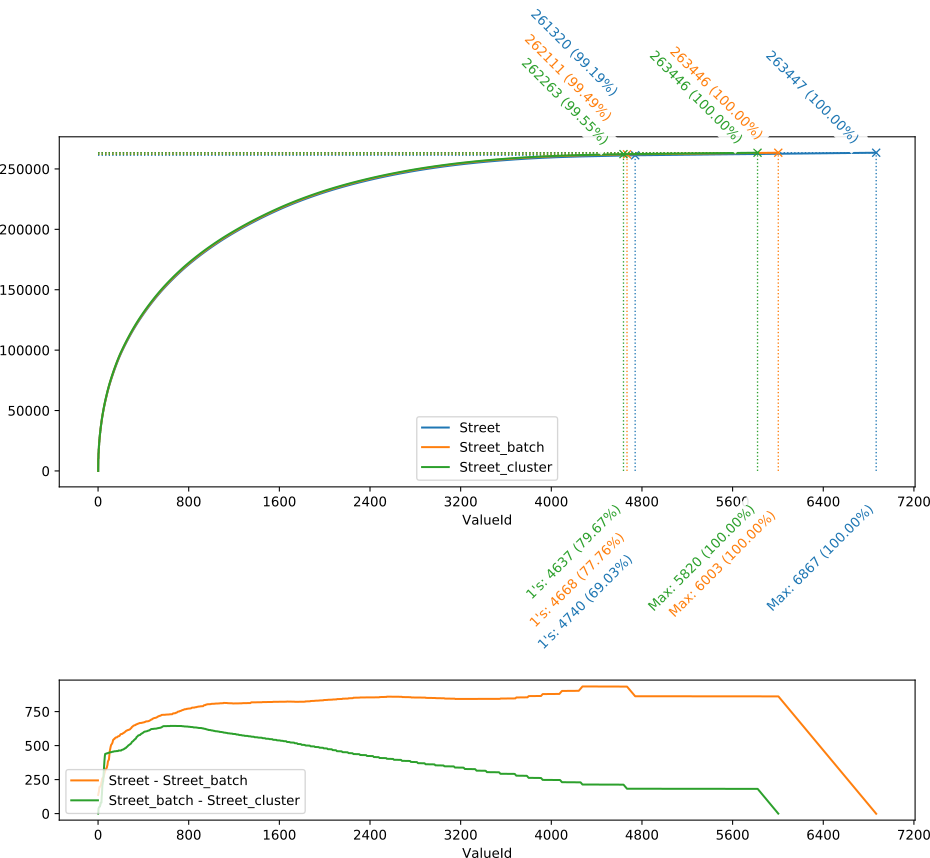 On peut observer de la figure ci-dessus (partie haute) que la principale différence entre les trois courbes se situe à l’extrémité droite, en particulier au niveau des valeurs uniques : entre la courbe bleue (données initiales) et la verte (après clustering), le nombre de valeurs uniques (à savoir la différence horizontale entre les “1’s” et les “Max”) a presque été divisé par deux (de 6867 – 4740 = 2127 à 5820 – 4637 = 1183) . Par contre, tout ce qui précède les valeurs uniques semble se confondre.