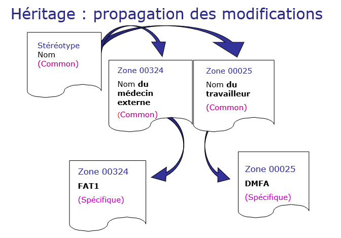 Het metadata management systeem kan ontworpen zijn om enkele tientallen administratieve databases te documenteren met een groot aantal gemeenschappelijke velden, waarvan sommige kenmerken identiek zijn (bijvoorbeeld formaat) en andere verschillend (bijvoorbeeld verplichte of optionele aard van een veld). Een overervingsmechanisme moet daarom geïntegreerd worden.