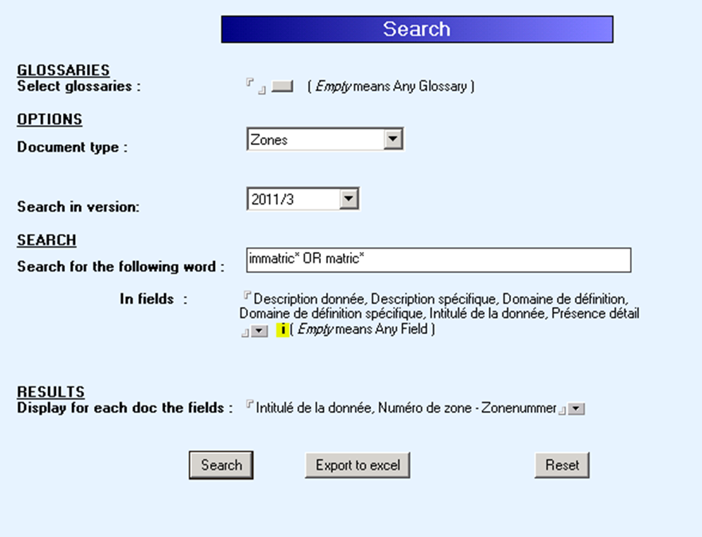 Figuur 5. Voorbeeld van multibase, multilingual en multifield searches met opties (bron: social security glossaries)