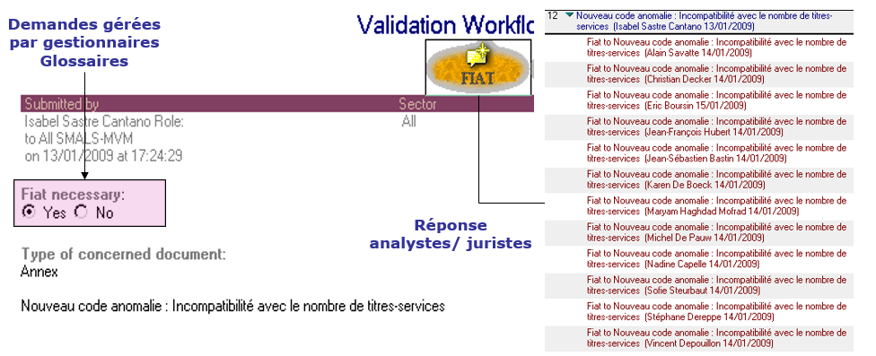 Vanwege de juridische, sociale en financiële belangen die op het spel staan, moet elke nieuwe versie worden gevalideerd door de betrokken IT- en juridische experts. Om deze validatie te structureren, begeleidt een workflowsysteem de implementatie van de Data Catalog. Dit maakt deel uit van een jaarlijks updateschema waarin de perioden voor bijwerking, validatie, acceptatie en productie nauwkeurig zijn vastgelegd. De workflow wordt centraal “gestuurd” door een team dat zich aan deze taak wijdt en ontplooit zich op gedecentraliseerde wijze, zoals bijvoorbeeld in het kader van het extranet van de sociale zekerheid (Figuur 1). Telkens een nieuwe versie aangemaakt wordt, wordt de historiek bijgehouden van de uitwisselingen tussen de verschillende verantwoordelijken, zodat men het interpretatieproces kan opvolgen. Aan de hand van een view kunnen de beheerders het aantal “fiats” volgen dat vereist is voor de publicatie van een nieuwe versie. Dit biedt een overzicht van verschillende onderling verbonden Data Catalogs.