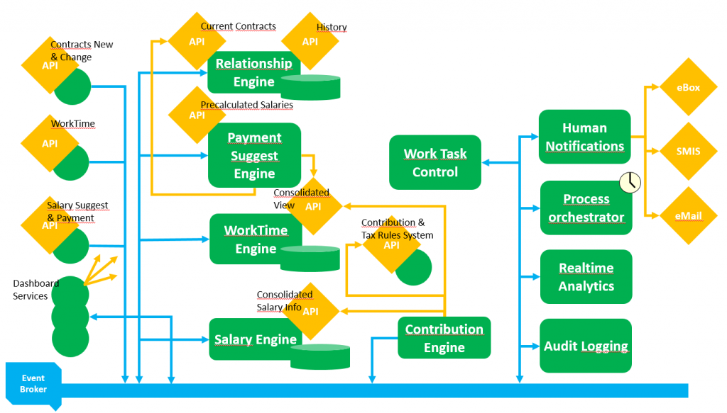 Het betreft ten eerste het consolideren van veranderingen in arbeidsrelaties, om zo altijd een up-to-date beeld te hebben van de huidige bestaande relaties, maar ook op de historiek. Ten tweede is er een berekeningsmodule voor salarissen, die ten gepasten tijde kan geactiveerd worden om de salarisvoorstellen te maken en uit te sturen. Het derde systeem is de WorkTime engine: deze krijgt een event binnen, telkens er gegevens binnenkomen betreffende prestaties, en zal deze consolideren tot een up-to-date view van wat er op dat moment gekend is betreffende deze gegevens (er kunnen bijvoorbeeld ook correcties van vorige data binnenkomen, die dan in rekening worden gebracht). Als voorlaatste zien we dan een systeem dat effectief uitbetaalde salarissen zal opvolgen en verwerken, en ten slotte hebben we nog de contribution engine, die op basis van heel wat gegevens uit de andere systemen en regelgeving, voorzien door een “Contribution & Tax Rules System”, de contributies berekent die de werkgevers zullen moeten volstorten. Ook dit laatste kan een real-time optelsom laten zien van wat tot dan gekend is, maar evengoed kunnen we hier maandelijks of driemaandelijks een event laten genereren om het saldo voor die periode mee te delen.