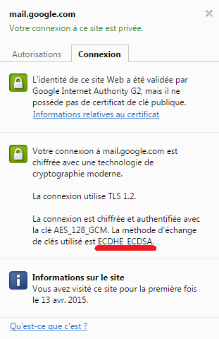 Un exemple concret (ci-contre) qui joint l’utilisation de ECDH et de ECDSA est le certificat SSL de certains sites web, tels que celui de Gmail. Notons que pour ce dernier, le protocole d’échange de clés est ECDHE, une variante de ECDH où les secrets choisis par les deux entités communicantes sont éphémères (d’où le “E” rajouté à l’accronyme), c’est-à-dire utilisés que temporairement, par exemple pour une seule session de communication. Ce choix permet ainsi de fournir une confidentialité persistante (forward secrecy en anglais) : même si un adversaire retrouve les secrets éphémères d’une session compromettant ainsi les communications correspondantes, il ne sera pas capable de compromettre les communications d’une session antérieure.