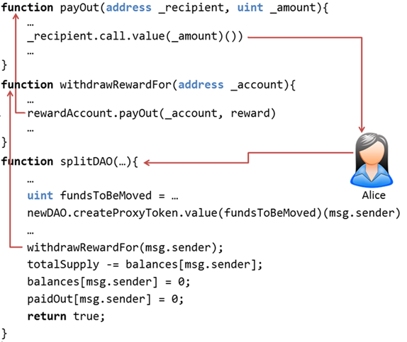 Deze aanval kan een tijdje doorgaan zonder dat de laatste regels van de splitDAO()-functie uitgevoerd worden – dus zonder dat de balans van het aanvallende contract (balances[msg.sender]) op nul wordt gezet en waardoor steeds hetzelfde bedrag naar het aanvallende contract gestort wordt.