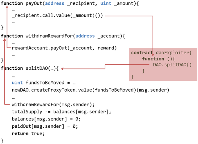 Het loopt fout [2] wanneer de oproeper van de functie splitDAO() geen externe account is, maar zélf een contract account. Daardoor wordt een recursieve aanval mogelijk, zoals geïllustreerd in figuur 4: