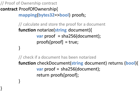 Hij toonde een smart contract dat een notaris toeliet om aan te geven dat een document verwerkt was. De code wordt – licht vereenvoudigd – weergegeven in figuur 1. De notaris registreert een document via de functie notarize(). Deze functie voegt normaliter aan de variabele ‘proofs’ een element toe dat bestaat uit de unieke sha256-vingerafdruk van het document (32-bytes hash), en de waarde ‘true’. Op het eerste gezicht lijkt dit prima.