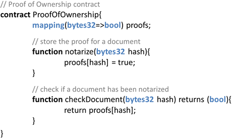 Al deze zaken kunnen eenvoudig verholpen worden door de vingerafdruk (hash) op de client te berekenen en enkel dit als parameter mee te geven aan de notarize()-functie. Dat resulteert in de code in figuur 2. De ironie is dat we in het smart contract nu gewoon sleutelparen opslaan – wat evengoed kan zonder smart contracts. Een erg overtuigend voorbeeld om de meerwaarde van smart contracts te aan te tonen, is dit dus helaas niet.