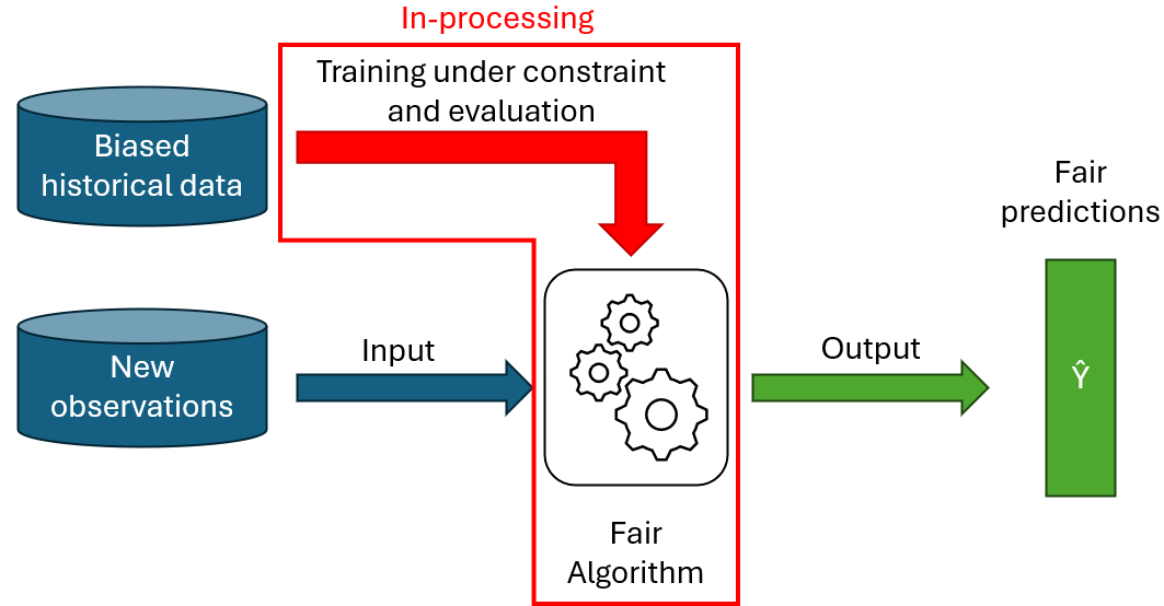 Les méthodes in-processing ont l’avantage qu’une fois le modèle entrainé, la fairness est directement inclue dans le modèle et celui-ci peut être utilisé librement, sans nécessiter de modification supplémentaire des données entrées ou des prédictions du modèle. De plus, modifier directement le modèle offre une grande flexibilité, car on peut y encoder des contraintes de fairness complexes.