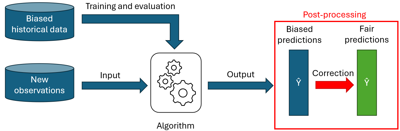 Les algorithmes de post-processing sont des solutions simples à mettre en place : ils sont indépendants du modèle prédictif utilisé, et peuvent donc s’utiliser avec des modèles « black-box ». De plus, le post-processing ne demande aucune modification ni des données, ni du modèle, et préserve donc l’intégrité du processus existant.
