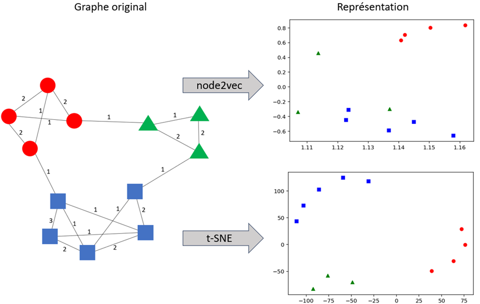 Une des limites des modèles de machine learning classique est qu’ils considèrent uniquement les données (variables continues et catégorielles) relatives aux observations, et ignorent l’information qui pourrait être tirée des relations entre les observations. Si des relations existent entre ces données, un graphe peut être construit, et les modèles de machine learning peuvent être enrichis via l’ajout de nouvelles variables extraites du graphe (il y a aussi un article de blog à ce sujet [11]). Ces nouvelles variables peuvent par exemple être une mesure de centralité (variable continue) ou le résultat d’un partitionnement (variable catégorielle), ou encore être obtenues via des méthodes de graph embedding (variables continues). Le graph embedding vise à obtenir une représentation des nœuds dans un espace multidimensionnel. Cet espace est calculé de sorte que, si deux nœuds sont proches dans le graphe, ils le seront aussi dans cet espace. Cet espace peut par exemple s’obtenir via des méthodes travaillant directement sur le graphe (node2vec [19], fastRP [20]) ou en travaillant sur base de similarités (kernelPCA [21]) ou de distances (t-SNE [22]) par exemple. Voir Figure 3 pour un exemple de représentation en 2 dimensions d’un graphe pondéré simple.
