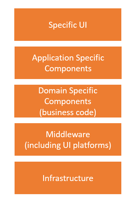 Een afgewerkte software, gebouwd voor een specifiek doel, met een eigen UI, is ongeveer wat als het hoogste in de “functionele stack” beschouwd kan worden. Dit is nauwelijks herbruikbaar, want purpose-built (met een grote uitzondering voor SaaS-software). Lager in deze stack vindt men business-domein-specifieke bibliotheken en APIs. Deze zijn, binnen een bepaalde context, al een stuk herbruikbaarder (maar niet onmiddellijk functioneel inzetbaar zonder er iets vóór of rond te bouwen). Nog lager in de stack vindt men zaken die over domeinen heen herbruikbaar zijn: database software, cloud platformen, algemene software libraries en raamwerken. De laagste elementen in de stack, daar denken we zelfs al niet meer bij na wanneer we ze hergebruiken: het gaat om constructies die in bijna alle programmeertalen voorkomen (gegevensstructuren zoals arrays, ondersteuning voor reguliere expressies, etc.).