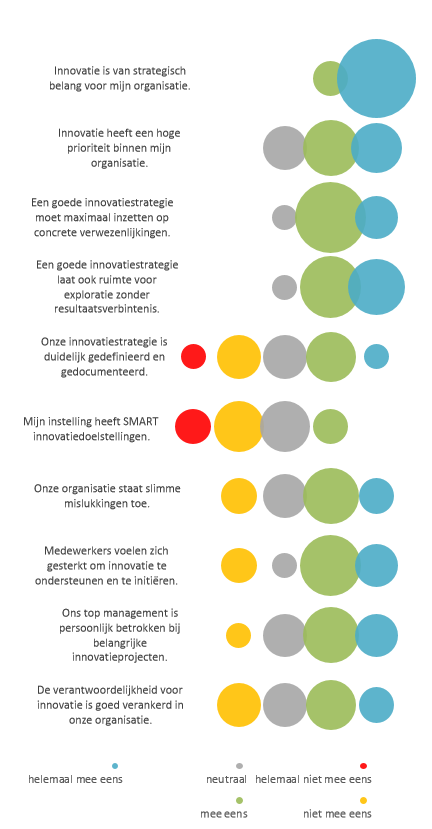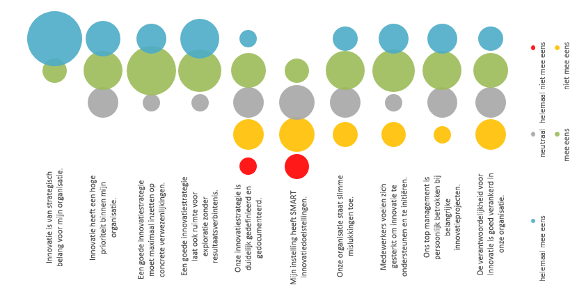 Het eerste deel van de enquête peilde naar het belang van innovatie voor de instellingen, en de maturiteit van de huidige innovatiestrategie, indien die bestaat. Op Figuur 1 zie je een deel van de resultaten van deze bevraging (de grootte van de cirkel geeft het volume aan van de antwoorden, per categorie). Wanneer we hier de eerste twee vragen bekijken, zien we dat innovatie duidelijk van strategisch belang is voor de instellingen, en dat er – in iets mindere mate – ook al een hoge prioriteit aan wordt gegeven. Verder zien we dat in zo’n strategie ook een goed evenwicht wenselijk is tussen concrete verwezenlijkingen en zuivere exploratie (men is er zich allicht van bewust dat dit eerste moeilijker wordt indien het laatste niet mag). Het verhaal verandert wanneer het gaat over een concrete aanpak: een duidelijke strategie is slechts bij de helft van de bevraagden aanwezig, en SMART doelstellingen nog minder. Ten slotte laat de grafiek ook zien dat de menselijke en organisatorische aspecten rond innovatie gemiddeld positief zijn (maar niet zo uitgesproken als dat men zou verwachten, gezien het strategisch belang).