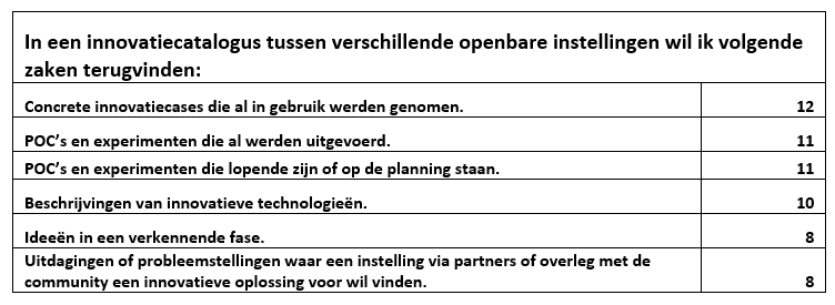 Als kers op de taart antwoordt men op de vraag of een innovatiecatalogus eveneens als samenwerkingsplatform zou moeten dienen tussen de instellingen (voor wat betreft innovatie) meer dan 80% ja.