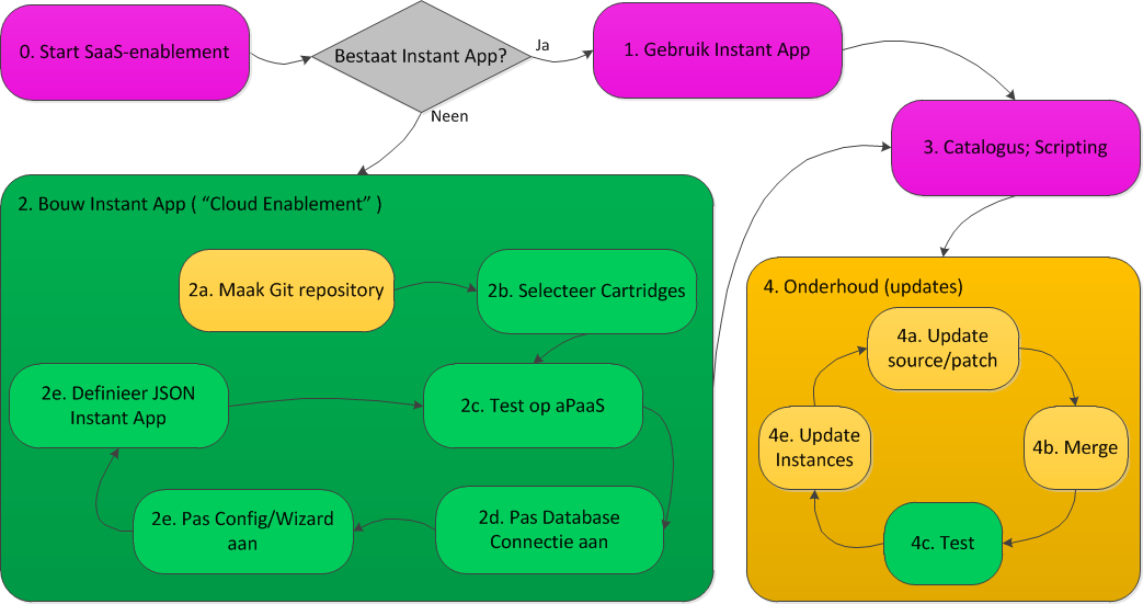 Onze methode werkt als volgt: We kijken eerst of er reeds een “instant app” beschikbaar is voor het aPaaS platform dat we gebruiken. Dit zijn voorverpakte applicaties die er reeds op gemaakt zijn op ons platform te werken. Indien zo’n instant app bestaat, is het gemakkelijk: we kunnen deze dan eenvoudigweg gebruiken en enkel het lanceren van nieuwe instanties moeten we dan nog automatiseren tot er voldoende self-service is. Dit laatste doen we door een catalogus-applicatie te voorzien waar we snel de instant apps aan kunnen toevoegen.