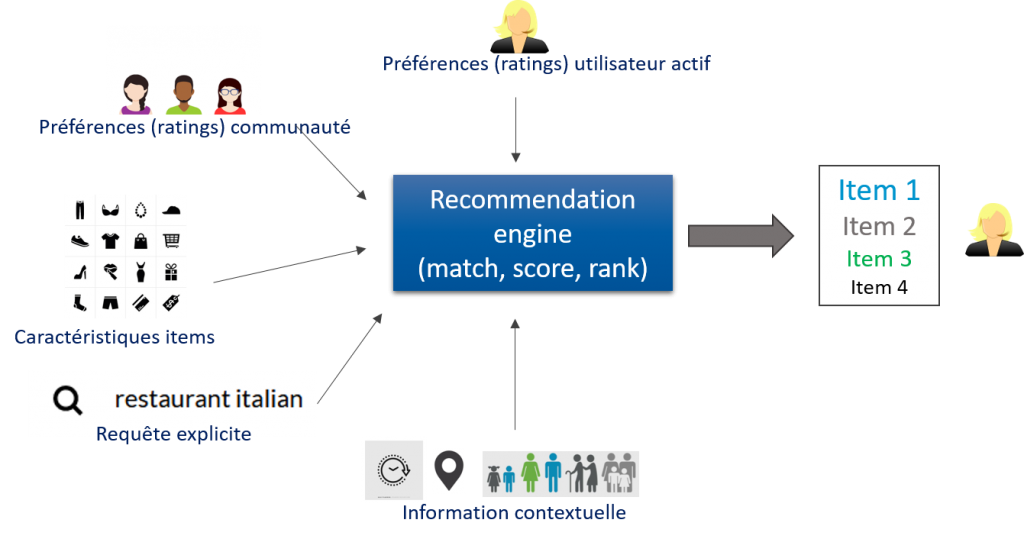Le principe du système de recommandation est de faire correspondre à l’utilisateur des items ou des contenus en se basant sur ses interactions précédentes avec le système et en tenant compte de ses préférences. Toutes sortes d’items peut-être recommandées : vidéo, musique, vêtement, application, document, article, …. Le but est entre autres d’accroître la satisfaction de l’utilisateur en personnalisant son expérience sur le site ou en lui envoyant des messages ciblés via des canaux tels que les emails, les newsletters, ….
