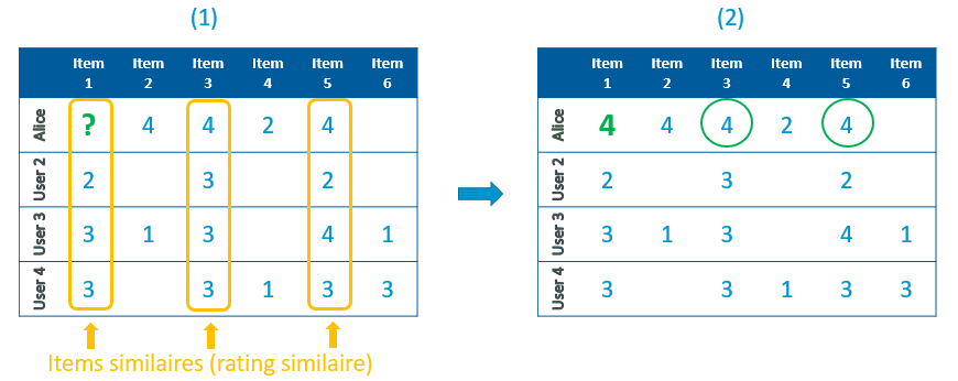 Pour connaître la préférence de l’utilisateur Alice pour l’item 1, (1) on retrouve les items similaires à l’item 1 et pour lesquelles Alice a donné un rating, (2) on utilise les ratings donnés par Alice aux items 3 et 5 pour prédire le rating de l’item 1.
