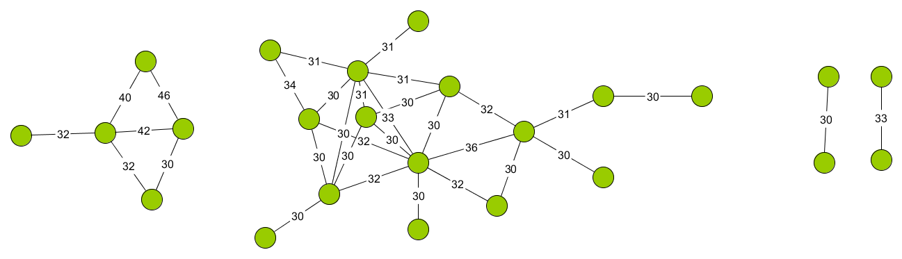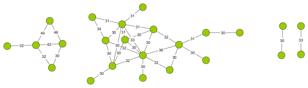 Le résultat de cette projection nous montre que bon nombre de travailleurs partagent un grand nombre d’employeur avec d’autre salariés. Par exemple, 32 couples de travailleurs (au total, 24 travailleurs), partagent deux par deux plus de 30 employeurs (jusqu’à 46), comme illustré ci-dessous, où chaque nœud représente un travailleur, et les labels sur les arcs le nombre d’employeurs commun entre deux travailleurs.