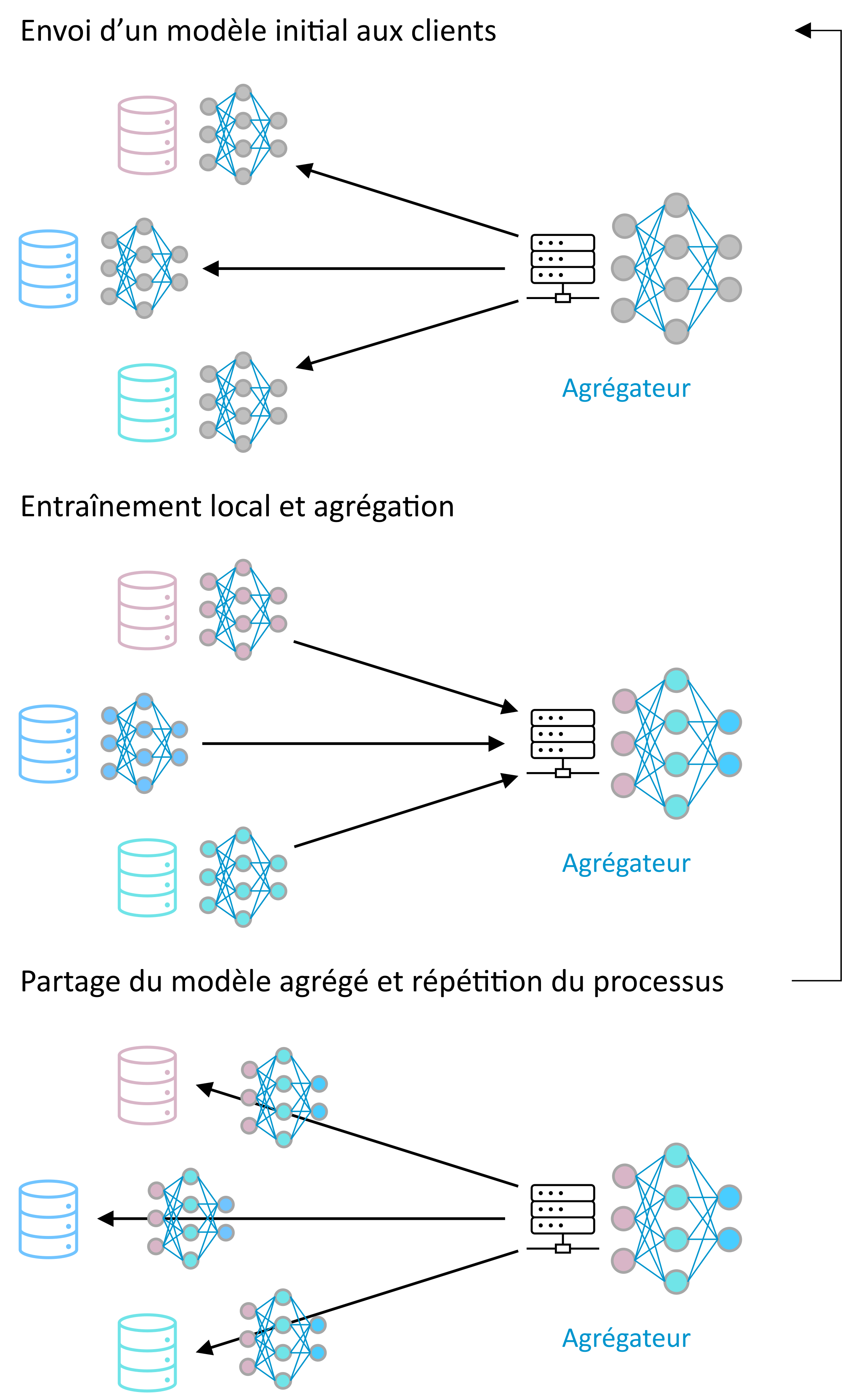 Introduit par McMahan et al. [17], l’apprentissage automatique fédéré (« federated learning ») est une manière distribuée et collaborative de faire de l’apprentissage automatique. Les machines participant à l’apprentissage ne sont pas obligées de partager leurs données et se contentent d’envoyer des modèles appris sur leurs données afin de contribuer à un modèle global qui est le résultat de la combinaison de l’ensemble des modèles locaux9.