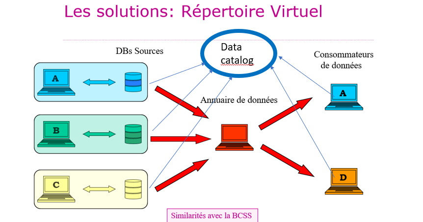 Met een virtuele directory maakt het dataregister (in het midden van het schema, in het rood) het mogelijk om, op basis van een kennisbank met toegangsrechten, data uit de brondatabases over te dragen naar de gebruikers. Er zijn overeenkomsten met de KSZ, een stellair netwerk dat de uitwisseling van data tussen instellingen mogelijk maakt. Wat de sociale zekerheid betreft, kunnen gegevensgebruikers een glossarium van de data (of “Data Catalog” in het schema) raadplegen in de verschillende versies, online op het portaal van de sociale zekerheid (6). Dit is een goede oplossing in de genoemde context.