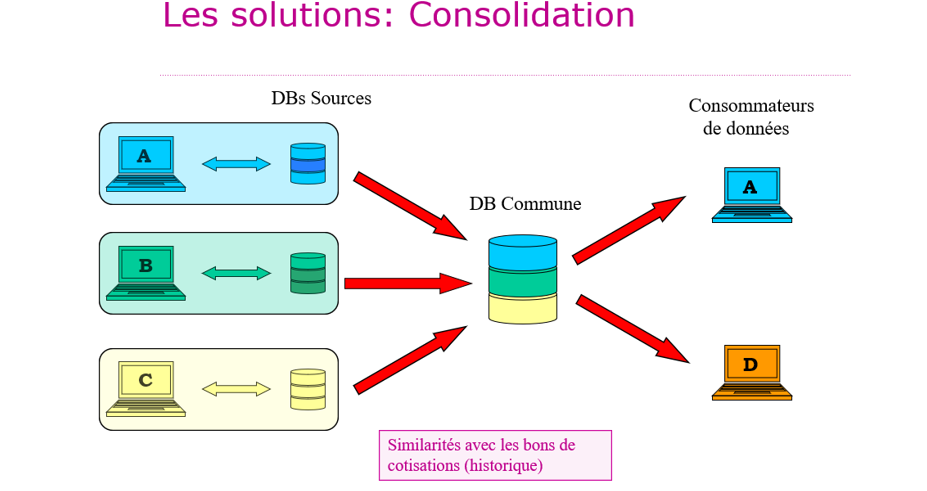 Bij consolidatie worden de brondata in één keer (“one shot”) naar een gemeenschappelijke database gekopieerd. Er staat geen “Data Catalog” op het schema, omdat de gemeenschappelijke database vervolgens wordt gedesynchroniseerd van de “brondata” die zij geacht wordt te vertegenwoordigen. Deze oplossing wordt niet aanbevolen. Ze werd in het verleden in de toepassing gebracht voor het beheer van zorgpremies, maar werd later opgegeven.