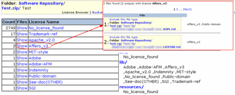 Het licentieoverzicht toont de gevonden licenties en een folderstructuur. In de figuur zie je bijvoorbeeld dat er in de licentielijst een Affero-licentie voorkomt die een grote impact kan hebben op de andere code.
