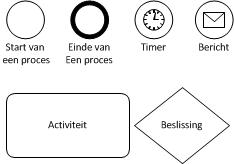 Voor het uittekenen van processen is het als business analist daarom beter om het aantal verschillende symbolen zo beperkt mogelijk te houden. Uit mijn eigen ervaring heb ik ondervonden dat voor nagenoeg elke type schema dat besproken moet worden met business users volgende symbolen volstaan: