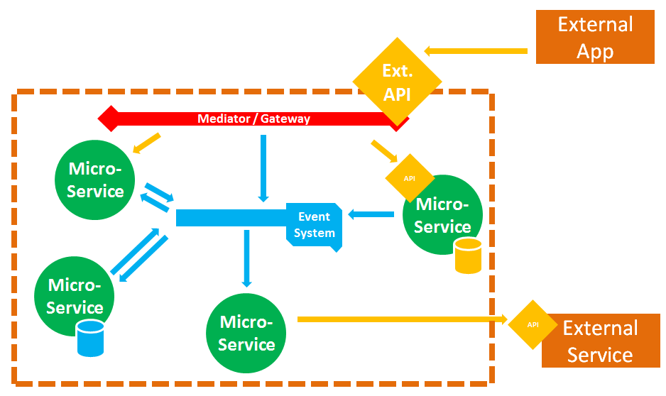 Een voorbeeld van een Microservices architectuur, waarbij een API wordt aangeboden aan de buitenwereld.