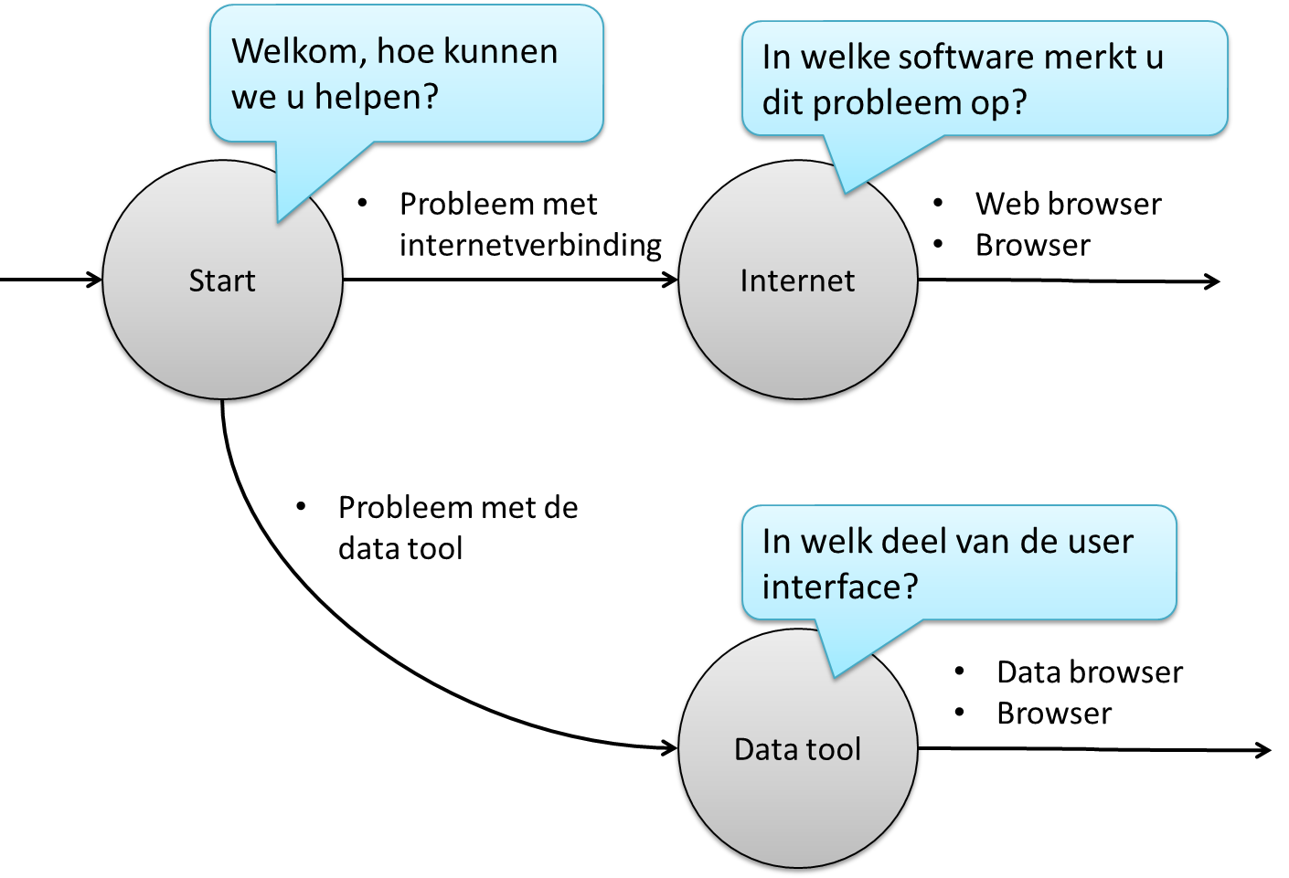 In het gedachtegoed dat we de eindgebruiker een flexibele interactie willen aanbieden via de chatbot, zou het niet kloppen om werknemers te vragen om steeds “web browser” te zeggen in de context van een internet probleem, of steeds “data browser” te zeggen in de context van een probleem met de data tool. Immers, de eindgebruiker heeft mogelijk al kenbaar gemaakt in een voorgaande zin binnen welke context de vraag zich afspeelt. Het is in principe redundant om “web” en “data” te vermelden (hoewel het is toegelaten).