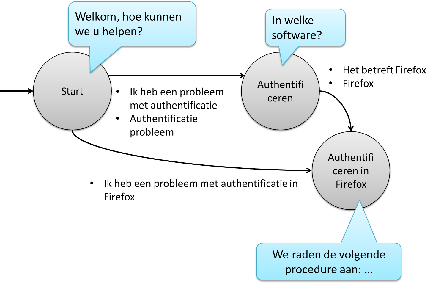 Vervolgens gaan we deze eerste versie flexibeler maken, zodat de eindgebruiker niet exact dezelfde terminologie moet gebruiken als de oorspronkelijke FAQ. Bovendien willen we toelaten dat aan het begin van het gesprek ook vragen mogen gesteld worden die minder eenduidig zijn als die in de FAQ. Daartoe kunnen we transcripts (chatlogs) verzamelen van conversaties tussen eindgebruikers en echte helpdeskmedewerkers. We maken eerst een selectie van transcripts die overeenkomen met de beoogde inhoud van de chatbot. We zetten vervolgens elke geselecteerde transcript om naar een of meerdere dialoog-paden. Zo’n dialoog-pad ziet eruit als volgt:
