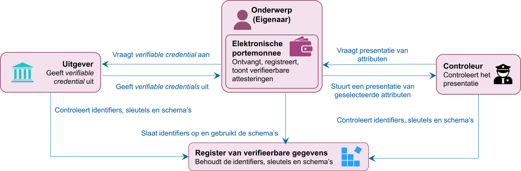 • E-portemonnee: entiteit die de verifiable credentials van een houder opslaat, met inbegrip van de software die namens de houder interageert met het ecosysteem.