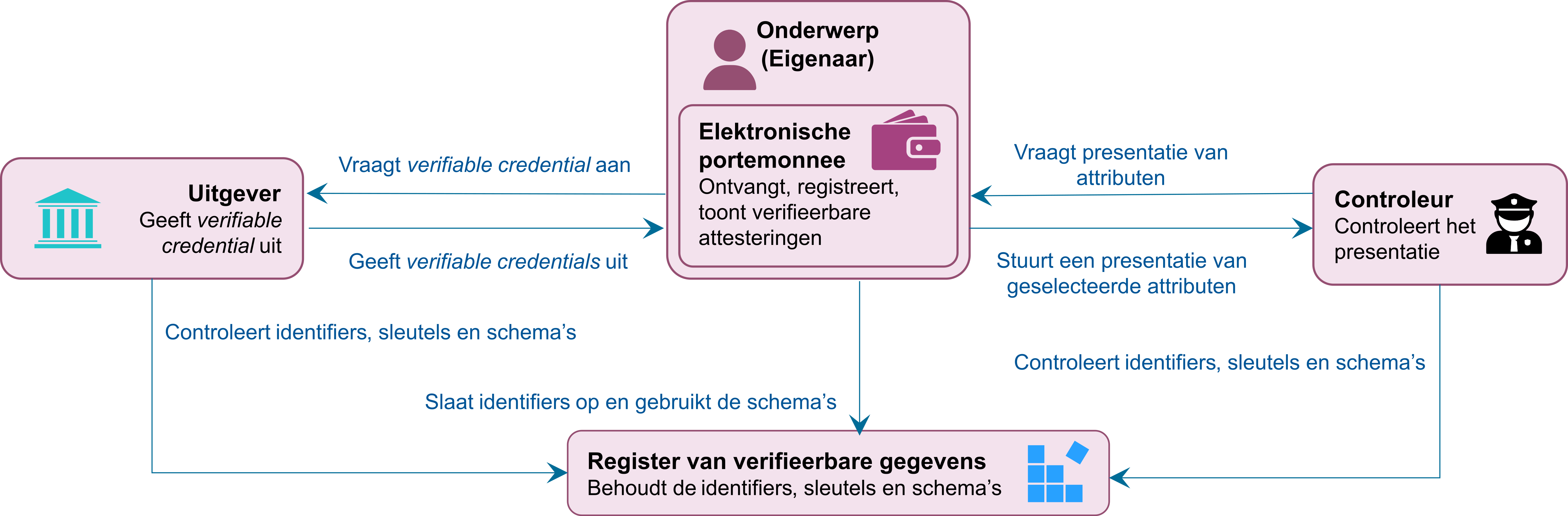 De belangrijkste spelers die betrokken zijn bij een architectuur voor verifiable credentials worden in Figuur 1 beschreven en omvatten: