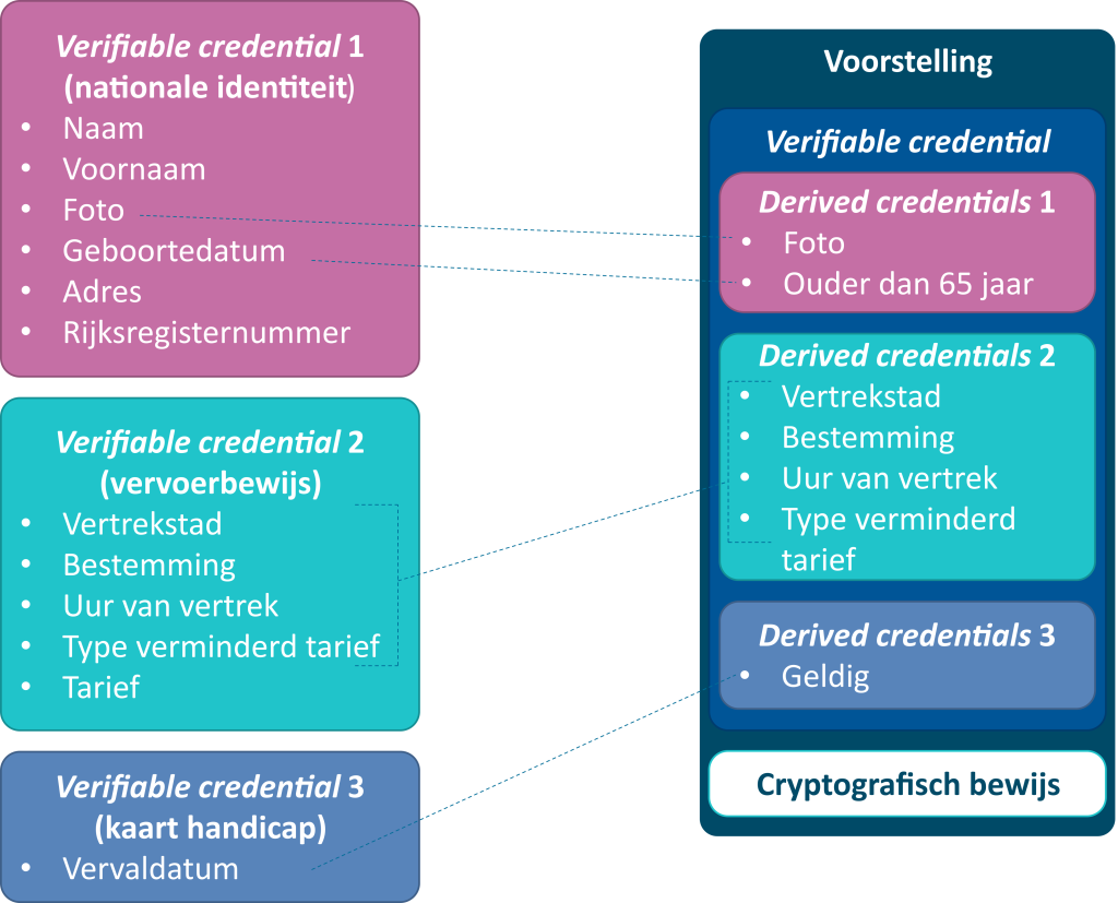 Figuur 2 – Voorbeeld van selectieve openbaarmaking en afgeleide effecten. De betrokkene heeft in zijn elektronische portemonnee, in de vorm van verifiable credentials: 1) een nationale identiteitskaart met foto, 2) een treinticket waarvan het gereduceerde tarief afhankelijk is van specifieke voorwaarden (handicap en leeftijd) en 3) een invaliditeitskaart. Wanneer het ticket wordt gecontroleerd, genereert de elektronische portemonnee een presentatie met de meeste informatie op het ticket, de foto op de identiteitskaart en een cryptografische afleiding van de geboortedatum die de leeftijd van de persoon bewijst en een andere cryptografische afleiding die de geldigheid van de gehandicaptenkaart op het moment van de controle bewijst. Dit alles wordt beschermd door cryptografisch bewijs.